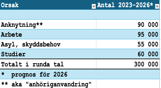 Det är minerad mark så jag tänker bara skriva detta för att ta fram fakta i siffror. För att få uppehållstillstånd i Sverige krävs i huvudsak någon form av anknytning eller flyktingskäl. Såhär fördelar sig beviljade ansökningar om uppehållstillstånd 2023 till 2026 (prognos). Jag har inga synpunkter på om det är bra eller dåligt, mycket eller lite, rätt eller fel.