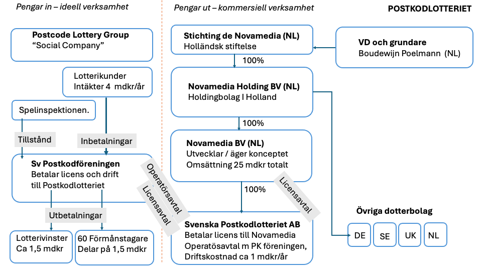 Inkomsterna kommer från lotteriet (4 miljarder kr). Utgifterna består av lotterivinster (1,5 miljarder kr) och bidrag till förmånstagare* (1,5 miljarder kr). Resten (1 miljard kr) går till administration. En del av administrationskostnaderna letar sig - via en snårskog av licensavtal, holdingbolag och en stiftelse i Amsterdam - ända upp till herr Poelmann. Stiftelser i Holland är i allmänhet befriade från både skatt och insyn. Men det har framkommit att ändamålet är att dela ut pengar till Poelmann.